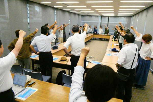 (報告集会で団結ガンバローをする様子)